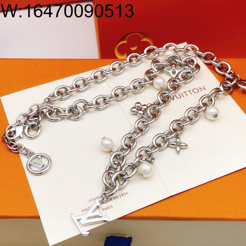 • AGG 루이비통 LV 진주 펜던트 체인 목걸이 실버
