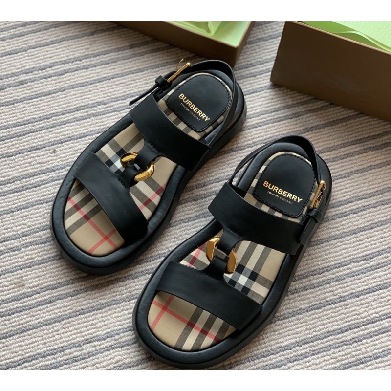 • [152] 버버리 레더 체인 디테일 버클 플랫 샌들 블랙 burberry