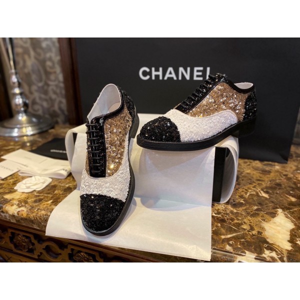 [팬더샵] 샤넬 레이스업 배색 시퀸 옥스퍼드 슈즈 더비 슈즈 Chanel