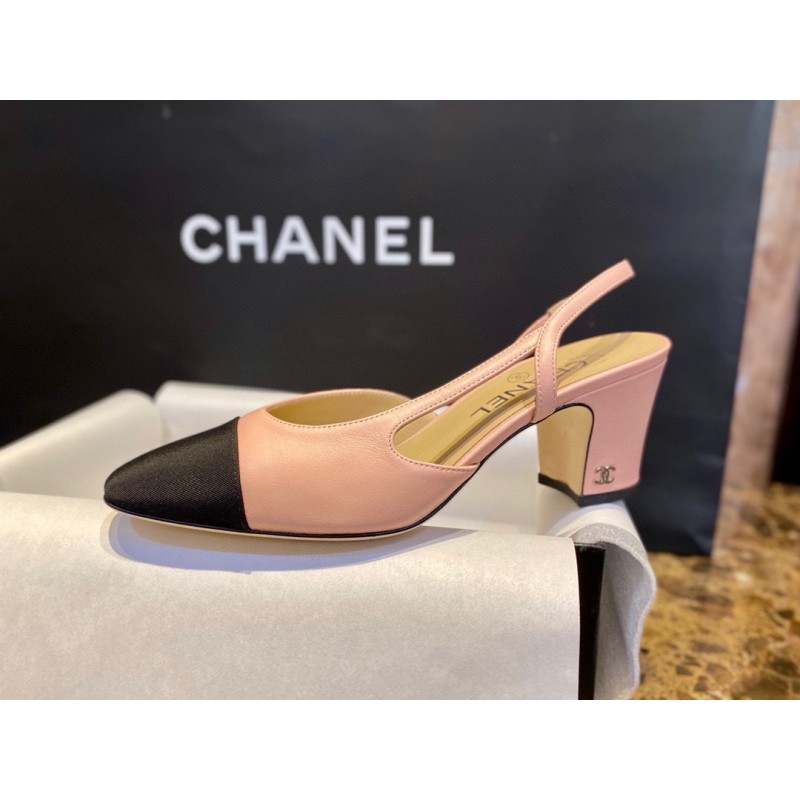 • [팬더샵] 샤넬 배색 미드힐 슬링백 핑크 Chanel