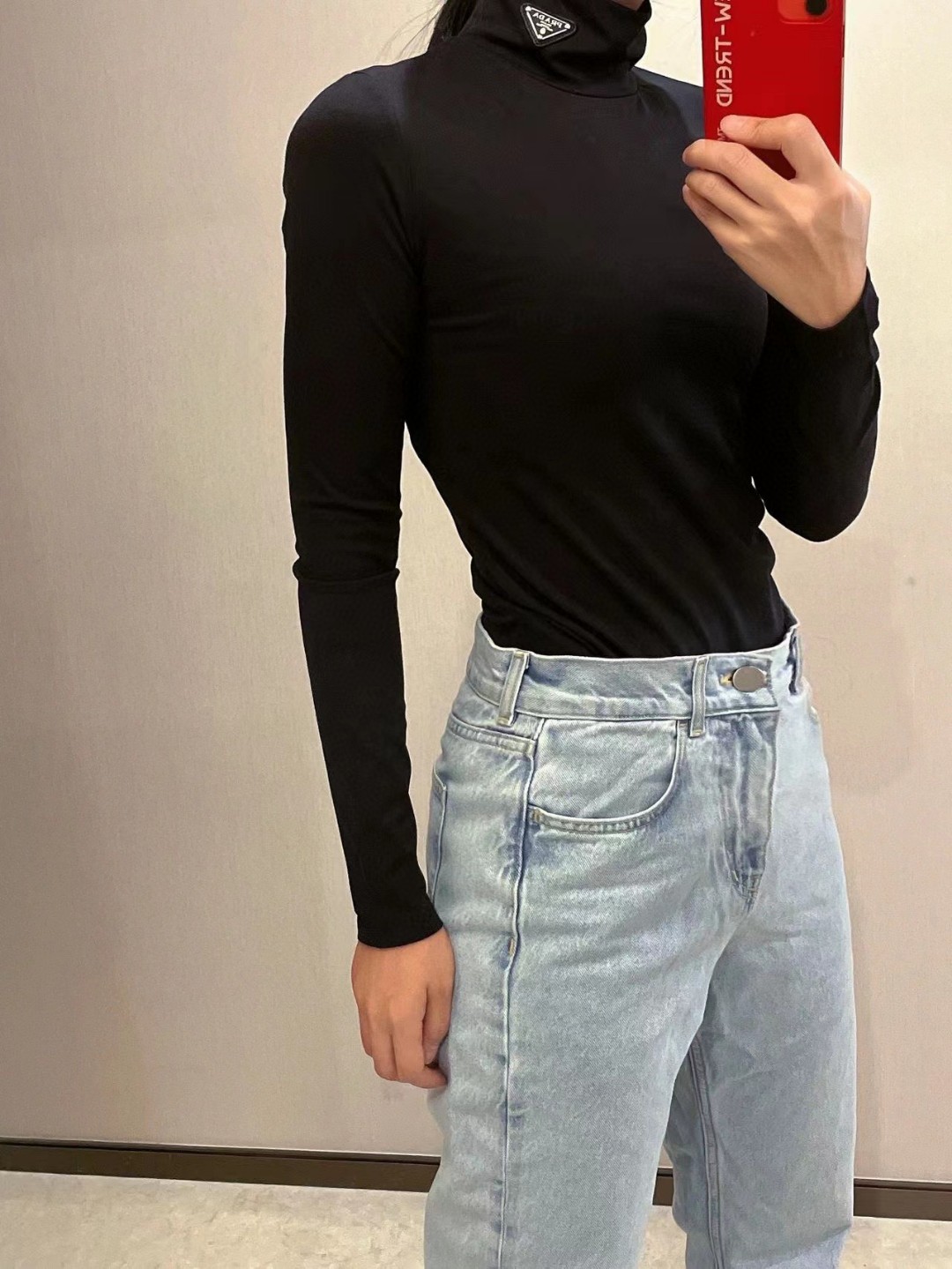 • [사슬공장] 프라다 목 삼각형 하이넥 긴팔티 블랙 Prada