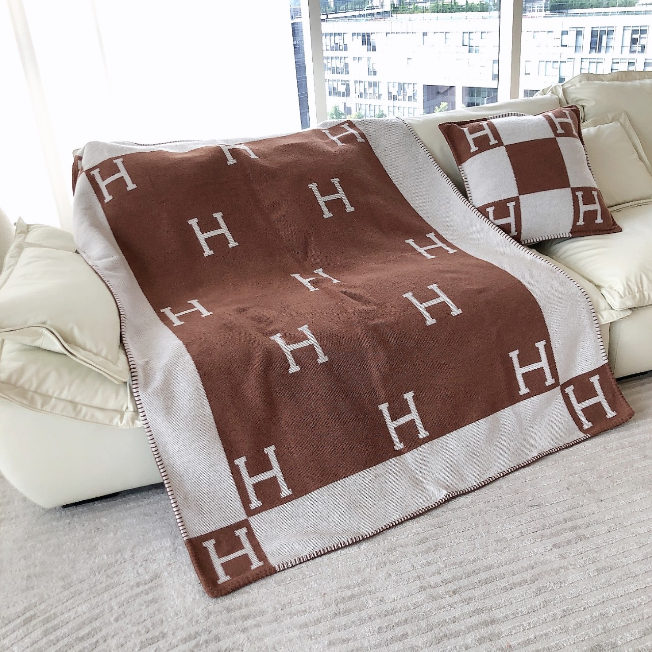• AGG 에르메스 H로고 캐시미어 담요 170*135cm 초콜릿 Hermes