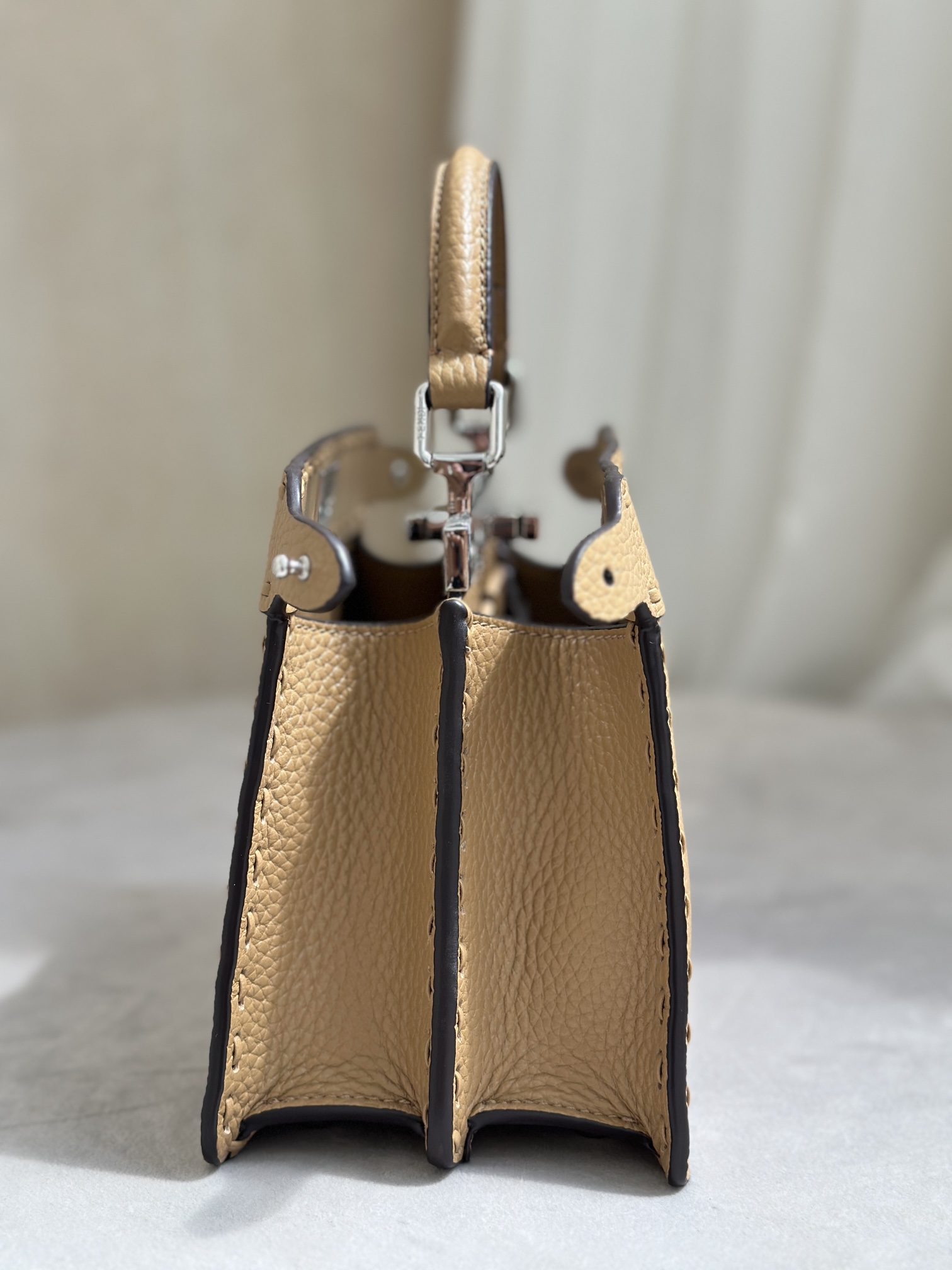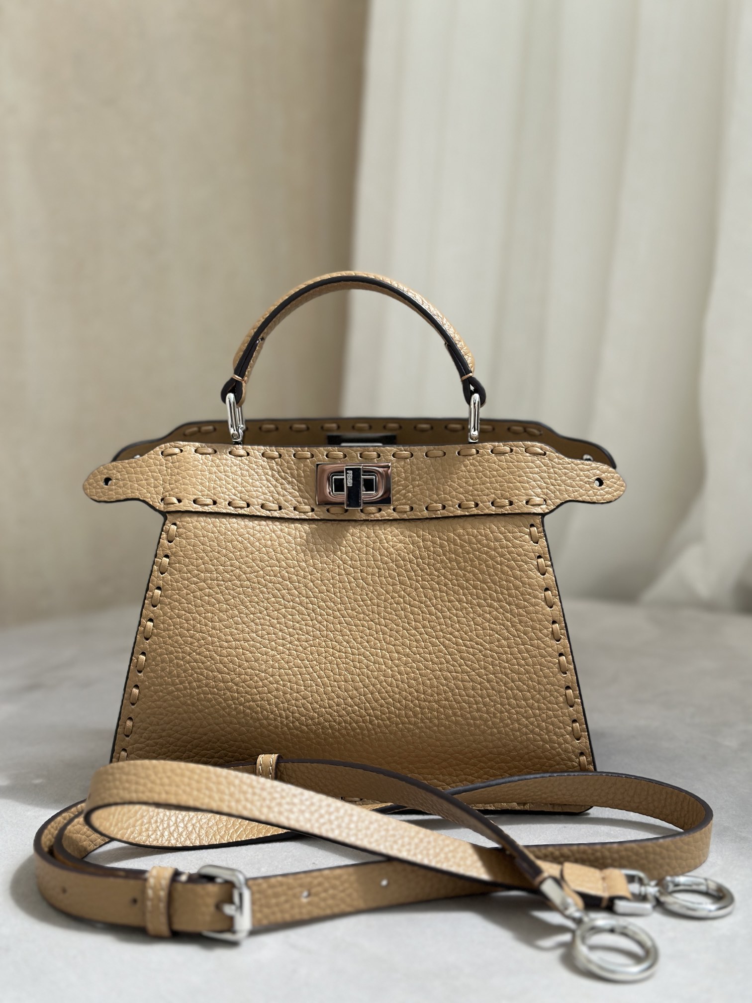 • [니콜] 펜디 피카부 I See U 미니 556 핸드 스티칭 탑스티치 멀티 컬러 셀러리아 백 라이트 브라운 20*11*15cm