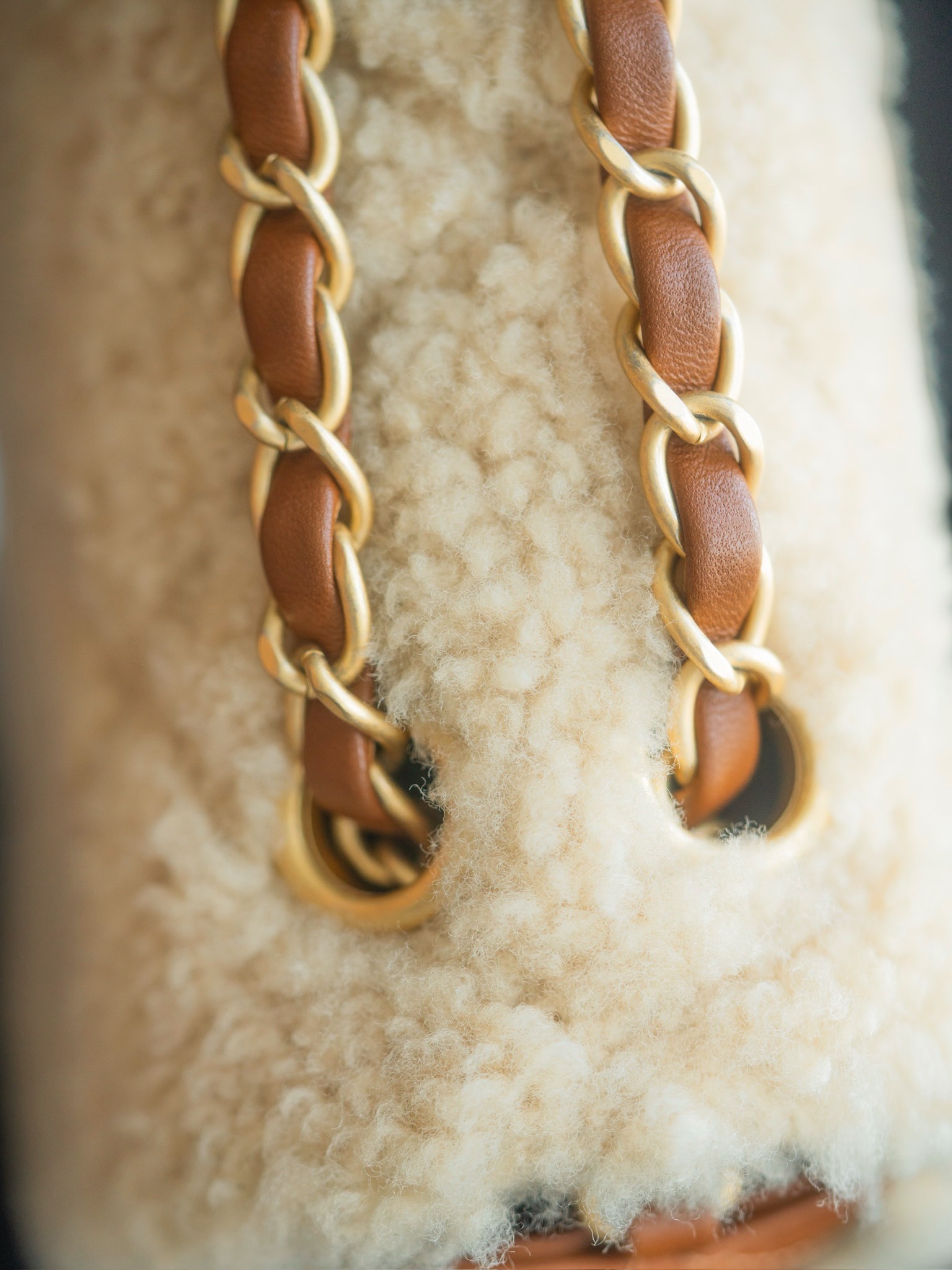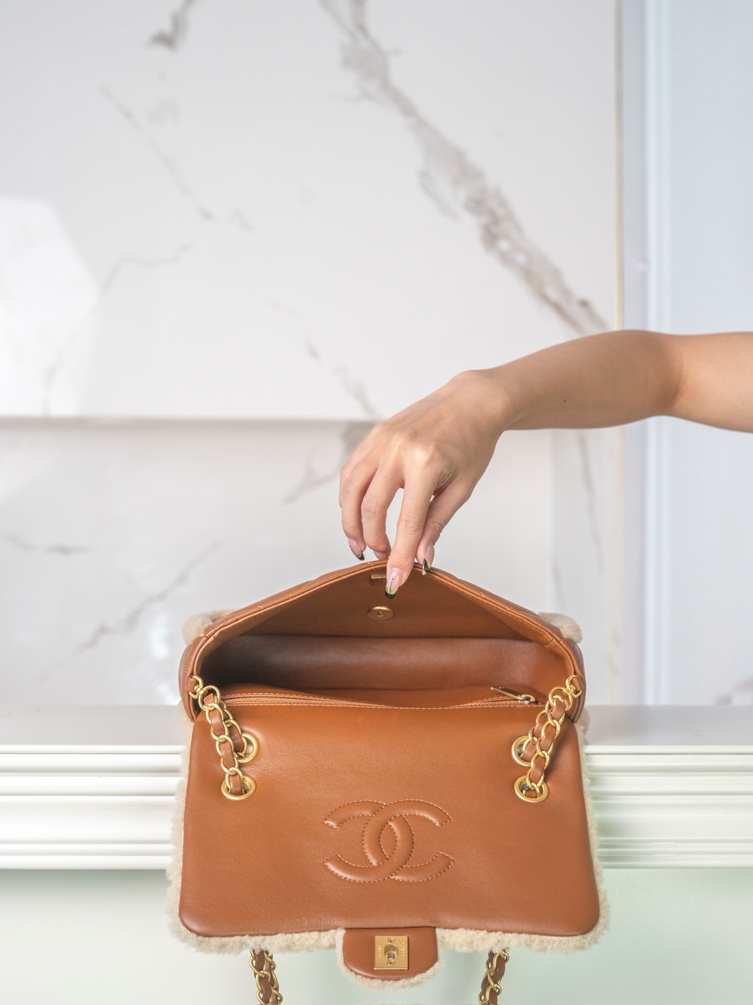 • [JD] 샤넬 플랩백 시어링 램스킨 골드 메탈 베이지 브라운 24K CF 라지 16*23.5*7.5cm