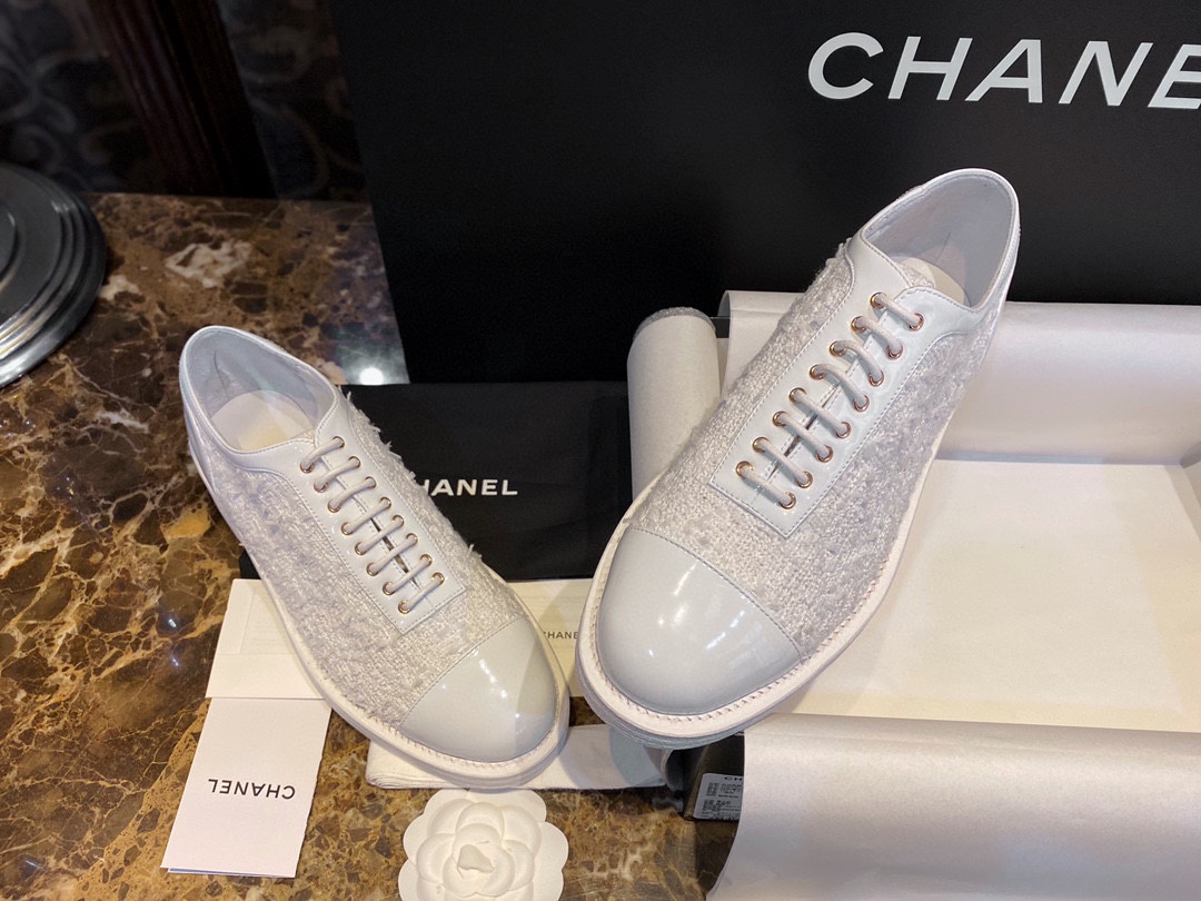 [팬더샵] 샤넬 금색 CC 로고 레더 트위드 옥스퍼드 슈즈 더비 슈즈 화이트 Chanel