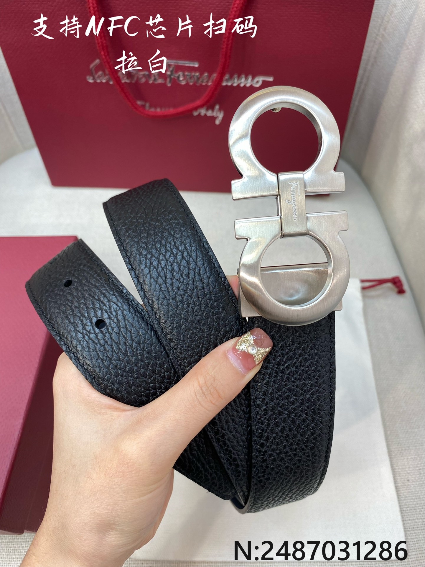 살바토레페라가모 실버 버클 가죽 블랙 벨트 3.5cm